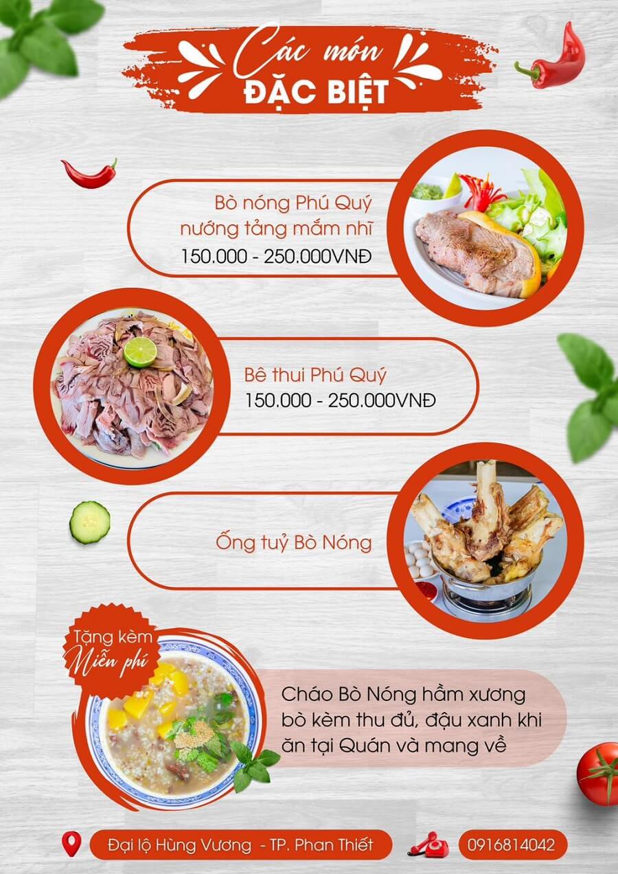 Quán Bò Nóng Phú Quý tại Phan Thiết là một trong những địa chỉ uy tín và nổi tiếng về món bò nóng - một đặc sản của đảo Phú Quý. Bò nóng ở đây không phải là bò nóng hổi, mà là bò tươi mới được mổ và bán hết trong ngày. Thịt bò được chăn thả trên các đồng cỏ tự nhiên, nên có vị ngọt, mềm và thơm. Bạn có thể chọn những phần thịt bò ưa thích, rồi tự tay chế biến thành nhiều món ngon khác nhau.