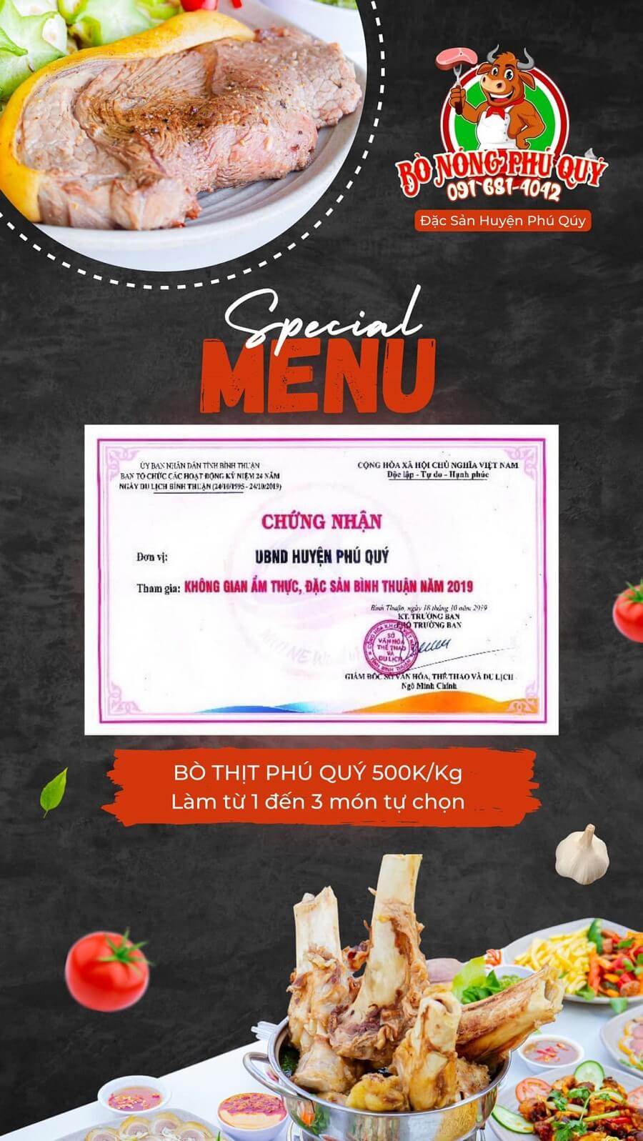 Menu thực đơn của quán bò nóng Phú Qúy tại Phan Thiết
